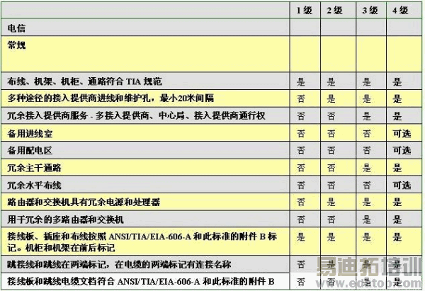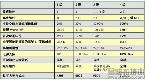 1级是最低级别;4 级是最高级别,配有全套多途径配电、发电和 UPS 系统。