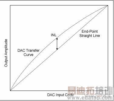 可以采用两种方法之一对INL进行定义:(1)端点INL或(2)最佳拟合INL。端点INL是采用DAC传输函数端点测得的实际值计算转换器的线性度;最佳拟合INL则是计算传输函数的斜率获得INL的峰值。