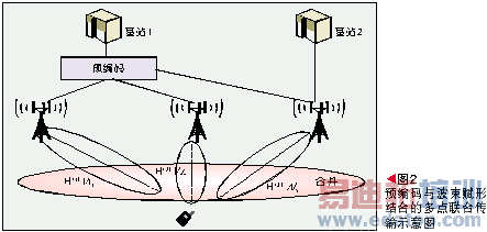 本文提出的多点联合传输中的预编码处理方式是将预编码技术与波束赋形技术结合用于多点协作传输。该方案的基本思想是,不同的参与协作传输的节点分别传输经过预编码后得到的一路数据,并将该路数据进行波束赋形之后发送出去。原理框图结构如图2所示。