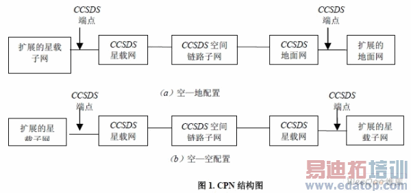 CCSDS 主网(CCSDS Principal Network,CPN) 起空间计划数据管理网的作用,提供端到端的数据传输, 以支持空间任务用户。该主网的主要任务是完成空一地或空一空之间的数字信息传输。CPN 的结构是: 一个轨道段中的"星载网"通过CCSDS"空间链路子网"与一个"地面网"或另一个轨道区段中的"星载网"相连 接。如图1 所示。