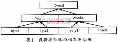 根据SATA2.0协议规定,系统进行数据操作和传输时的基本单位是Dword (Double、word),共计32 bit,由低有效字wordO和高有效字wordl组成,也可以看做是由byte0~byte3四个有效字节组成。其相互关系如图1所示。