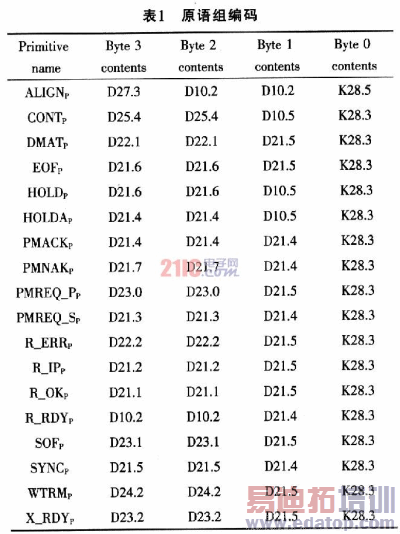 原语(primitive)是主机与设备间链路层交互的载体,一般由一个带有控制字符byteO和附加字符bvtel—byte3的Dword组成,SATA2.0协议将原语的byte0称为K字符,将附加字符bytel一byte3称为D字符,由不同的K字符和D字符可以构成原语组。字符内容由8B/10B转换中的6—4分组确定。其原语组的编码如表1所列。