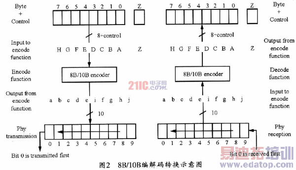 8B/10B编码是将一组连续的8位数据分解成两组数据,一组3位,一组5位,经过编码后分别构成一组4位代码和一组6位代码,从而组成一组10位的数据发送出去。相反,解码是将l组10位的输入数据经过变换得到8位数据位。其8B/10B编解码过程如图2所示。