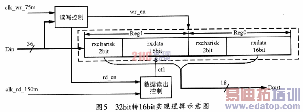 根据上面16 bit至32 bit位宽转换分析,需要将数据处理逻辑输出的32 bit数据拆分成两个16bit数据交给GTP进行发送。同时在转换的开始时刻,要求先发送一个DW的低字,然后发送其高字,而不能先发送一个DW的高字,否则接收端将无法正确恢复出DW。另外,150 MHz时钟和75MHz时钟的相位一致,同样是这种转换稳定进行的保障,因此,这两个时钟也必须接到DCM响应频率的输出。其32 bit转16 bit的实现逻辑示意图如图5所示。