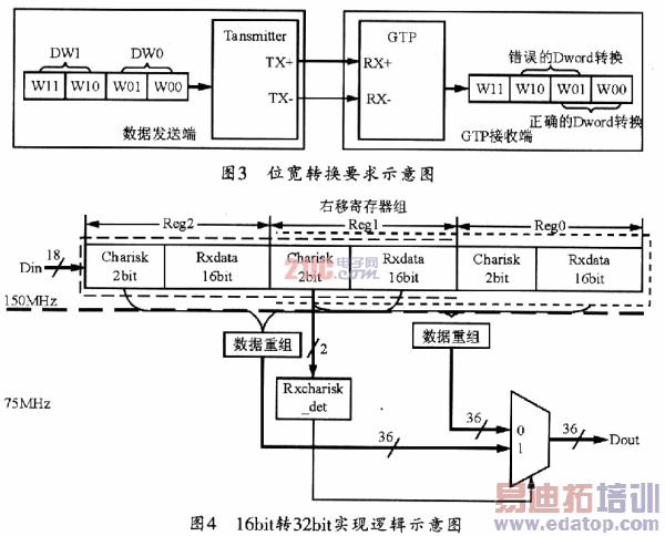 该模块将GTP接收后的150 MHz 16 bit并行数据转换成数据处理逻辑可以工作的75 MHz 32 bit的并行数据。图3所示为其位宽转换要求示意图。