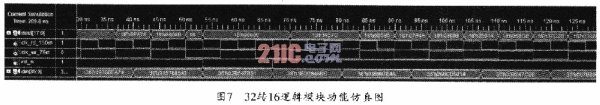 通过对位宽转换模块的Verilog HDL描述,可在ModelSim se以及Xilinx ISE集成开发环境下进行功能仿真和综合布局布线后的时序仿真,也可在Xilinx Virtex-5 xc5vlx50t FPGA上进行验证。图6所示为16 bit转32 bit逻辑仿真图。而其32 bit转16 bit逻辑仿真图如图7所示。