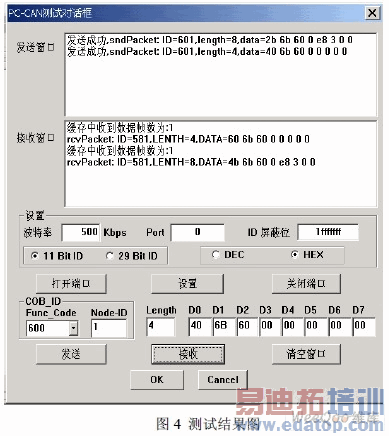 例如,要将1号地址的电机轮速期望值设为0x3E8,电机轮速期望值在OD中的索引为0x606B,使用启动域下载协议,加速传输。则设置地址段为1,信息帧长度为8,信息帧内容为2B 6B 60 00 E8 03 00 00。发送成功后返回应答信息帧内容为:ID=581,LENTH=4,DATA=60 6B 60 0 0 0 0 0,说明写入操作正确(见图4)。