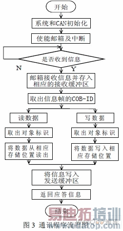 采用不同的发送邮箱发送数据长度不同的信息帧。本程序设计中,采用邮箱4发送4字节长度的信息帧,采用邮箱5发送8字节长度的信息帧。这种方式可以提高信息传输的效率。软件设计流程图如图3所示。
