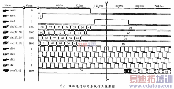 VHDL编程采用模块式设计。首先建立4个模块,即FIF0、MUX、counterl、counter2。其中的FIFO既可以调用lpm-FIF0(dualClock)来修改其中的一些关键参数以符合要求,也可以手工编写程序实现,这里采用调用宏模块的方式。值得注意的是,FIFO的输入输出时钟频率不同,因此必须采用双时钟FIF0。MUX、counterl、counter2是配合FIF0使用的多路复用器和分频器(计数器),均应手工编写其源程序。几个子模块完成以后,要新建一个总的系统模块(system)来调用子模块,以在system模块中完成系统端口的定义以及各个子模块之间的逻辑关系描述。这种设计有利于逻辑设计的集成化,从而为后续的改进提供方便。图2为编译通过后的系统仿真波形图。