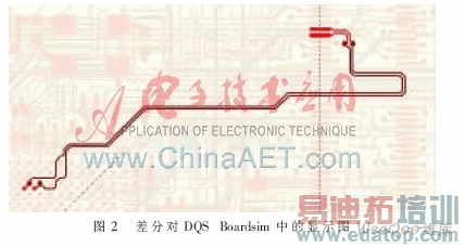 在运用CAD设计工具设计得出具有关键元件布局和关键网络的走线的基本元素的PCB后,综合考虑如电气、电磁兼容性(EMC)等因素对信号完整性(SI)的影响以及这些因素之间的相互作用,从而进行Boardsim布线后的仿真分析与验证。下面选取一些重要的DQ、DQS、MA网络进行分析。在进行完整PCB的布线后,可以通过Boardsim导入PCB文件。图1为地址/控制线在Boardsim中的显示图,图2为差分对DQS在Boardsim中的显示图。