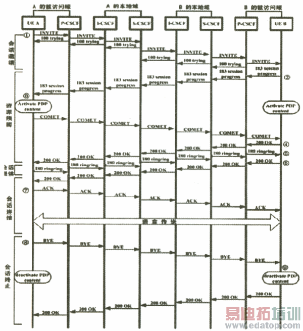 如图4所示是最普通的两个漫游用户的会话建立过程。一个完整的IMS呼叫分为会话邀请、资源预留、会话提供、会话连接、会话终止五个阶段。