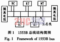 1553B总线采用异步、半双工方式传输,传输速率1 MB/s。1553B总线传输协议规定的传输过程为:BC向某一终端发送一个接收/发送指令,RT在规定的响应时间内发回一个状态字并执行消息的接收/发送。在操作过程中BC始终掌握总线的控制权,总线上任何时候只有一个BC,但可以最多挂31个RT或MT。在总线的数据传输过程中,MT按要求监视总线上的数据,并将这些数据输出或者存盘以便实时地监测这些数据的传输状态或便于后续分析。1553B采用双冗余总线,有2个传输通道,保证了良好的容错性和故障隔离。如果当前总线的数据传输出现错误或故障,数据可以自动从冗余总线上传输。1553B总线的传输介质为屏蔽双绞线。其总线结构简图如图l所示。