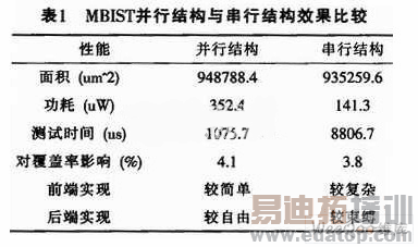 对于串行MBIST结构,在前端设计时需要考虑到所有SRAM的大小等情况,而多数设计中,嵌入的SRAM大小各不相同,所以,前端实现较复杂;复用同一套MBIST结构(如激励产生结构和比较电路等)虽然节省面积,但为了有利于时序收敛及绕线,往往需要SRAM靠近与之有逻辑关系的功能单元,但这会对芯片整体物理版图的设计带来一定束缚;SRAM数量较大时,逐一测试显然能使功耗降到最低,但可能导致测试时间增长,测试成本上升。