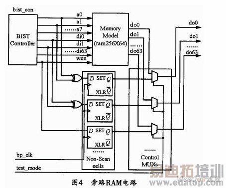若测试覆盖率较低,首先应分析DRC(design rule constraint)Violations,并尽量消除DRCViolations。再分析AU(ATPG untestable)报告,减少AU的数量。按照模块层次来报告测试覆盖率时,应找到覆盖率低的模块重点分析。该项目的AU报告中和RAM有关的部分占了很大一部分。RAM自测试模块的测试覆盖率只有6%。分析工具把RAM当做black box,由于这些SRAM的数据位很宽,故SRAM数据端口不可控和不可测的逻辑(称为阴影逻辑)更多,芯片的测试覆盖率也更低。给RAM加旁路(bypass)逻辑,测试模式下将输入和输出连起来,可使原来不可控和不可观测的逻辑变化反映到扫描链上,使之变得间接可控和可观测,从而提高整个芯片的测试覆盖率。RAM的输入比输出多,故可用XOR连接。对于XOR/XNOR门,为了将故障响应从它的一个输入传播到它的输出,可根据方便程度设置所有其他的输入为0或1。而对于AND/NAND门,为了将系统的故障响应从它的一个输入传播到它的输出,则必须通过将其他输入设置为l来实现,其中"l"对于AND/NAND门是一个非控制值。同理,"0"对于OR/NOR门也是一个非控制值。图4所示是旁路RAM的电路示意图。图中,多路选择器由test_mode信号控制,与RAM的输入输出连接的逻辑可测,RAM模块的测试覆盖率可提高到98.3%,相应的整个芯片的测试覆盖率提高了4个百分点。