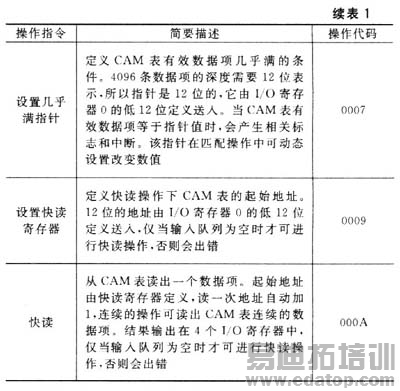 通常情况下,MCM69C232通过写控制口数据和指令来准备匹配操作。一般步骤是把数据项装入4个I/O寄存器,然后往操作代码寄存器写入操作代码,即可完成一种指令的操作。指令完成后,CAM表的内容可能会被修改,标志寄存器的相应位会被置位,错误代码寄存器会返回错误码,当使能时,还会触发中断。芯片的操作指令如表1所列。