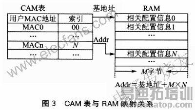 当进行MAC地址检索时,CPU首先以MAC地址为关键字通过MAC-CAM表的检索得到对应的索引值,然后再根据索引值找到RAM表中该MAC地址对应的相关信息的存储位置,并由此地址获得相关配置信息。在RAM中的相关配置信息中可以存放诸如MAC地址、用户端口、有效标志域等其他信息。CAM表与RAM的映射关系如图3所示。