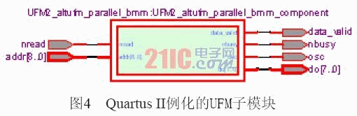 MAX II CPLD中的用户闪存UFM模块主要用于存储LCD控制器打开之后,需要在LCD屏上显示的信息。采用十六进制(Intel格式)文件(.hex)对UFM进行设置,并利用UFM宏功能进行例化。