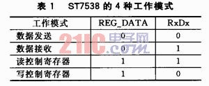 ST7538通过串行接口与主控制器交换数据。在使用RxD、TxD、CLR/T交换数据时,数据传输由REG_DATA和RxDx线来管理。有4种工作模式:数据发送、数据接收、读控制寄存器、写控制寄存器,如表1所列。