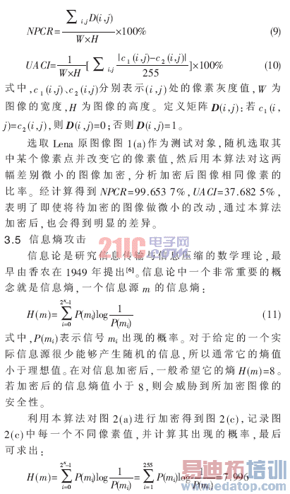 像素数目改变率(NPCR)是指当待加密图像改变一个像素时,加密后图像像素数目的改变率。NPCR越大,表明加密算法对于待加密图像变化越敏感,则该加 密算法抵抗明文攻击能力越强;平均强度变化率(UACI)是指待加密图像和加密后图像相应像素的平均强度的变化率,该指标越大,表示加密后图像与待加密图 像比平均强度变化越大,则该加密算法抵抗差分攻击能力越强。设两幅加密后的图像分别为c1和c2,则: