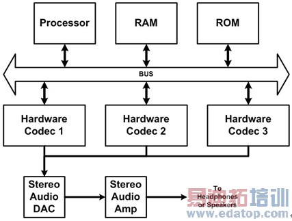 方案2,采用一颗性能相对较低的处理器搭配专门的音频处理硬件,所有的音频处理任务都由专用硬件来完成。通常,这块硬件作为外设挂在系统总线上。音频采样由处理器通过总线送给编解码硬件,或者由编解码硬件通过DMA直接从内存中读取。在这种方案中系统总线也是共享的。