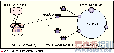 以P2P的互联网VoIP应用来说,电信网的用户如何能呼叫到P2P的VoIP终端?需要跨接在融合网络之上的寻址机制来实现相互发现。如图2所示,传统公共交换电话网(PSTN)终端发起呼叫,经过ENUM查询获得某个P2P VoIP终端的地址,进而寻址路由到被叫的P2P节点。