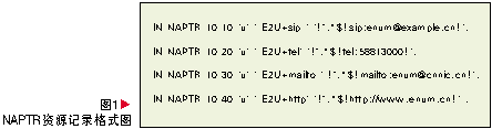 目前使用的后缀为".e164.arpa",得到一个域名格式的字符串"8.7.6.5.4.3.2.1.0.1.6.8.e164.arpa"。然后,就可以为这个电话号码在DNS中添加名字权威指针(NAPTR)资源记录。NAPTR的资源记录格式如图1所示。