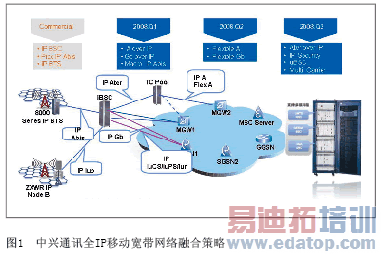 IP GERAN是中兴通讯全IP网络解决方案的重要组成部分,中兴通讯在专利、标准、基站设备、终端、网络优化、增值业务等方面做好了全面准备,正在积极开展研究工作,从而定义一个向全IP网络演进的成功途径。中兴通讯全IP移动宽带网络融合策略见图1。