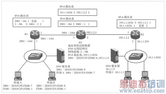 当终端C向终端A发送数据时,终端C构建一个以10.1.1.1.1为源地址,193.1.1.1为目的地址的IPv4分组,该IPv4分组被IPv4网络路由到路由器R3。