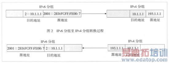 IPv4分组转换成IPv6分组时各字段的转换过程如表3所示,源和目的地址的转换如图2所示。