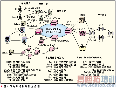 城域汇聚/城域核心可使用SDH/MSTP环/RPR、CE/PTN网络(例如PBT和T-MPLS),甚至在业务颗粒非常大有必要时可直接使用WDM,甚至引入OTN(OTH+ROADM)技术作为实现IPoverWDM/OTN/ROADM的手段;