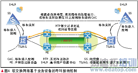 接纳控制有基于业务设备的接纳控制和基于IP网络设备的接纳控制两种。业务层设备的接纳控制方案中,IP网络根据规划的业务量为业务网络准备了相应的资源,业务设备则对接续中的业务量作计数,并对超限的业务拒绝接纳。而IP网络设备的接纳控制,则是在IP网络资源控制服务器的参与下,由IP网络设备拒绝接纳超限业务。如图4示意。