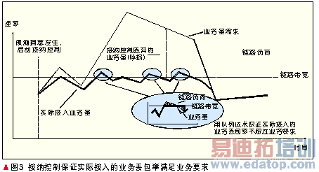 业务(如IPTV、VoIP)可以允许瞬间较大的丢包率,以及持续较长时间非常小的丢包率,如果长时间持续拥塞,则业务的体验,如VoIP业务的MOS值,会下降直至不可接受,所以秒级以上的QoS风险需要接纳控制技术[6]来应对,如图3所示。