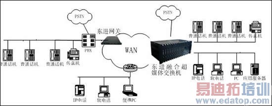 东进融合超媒体交换机完成同一网络或不同网络间的语音交换,主要包括媒体转换、信令解析、语音交换功能。东进融合超媒体交换机兼有IP电话服务器和VoIP媒体网关功能,可使各分支机构能通过广域网(WAN)实现舜思涞挠镆敉ㄐ牛