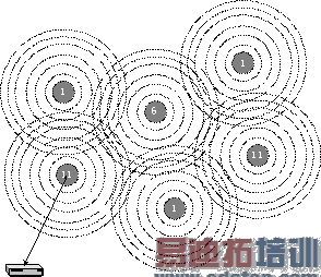 这个动态协商连接的处理方式使得网络管理员可以将无线网络覆盖范围扩大,这是通过在这些地区布置多个覆盖范围重叠的接入点来实现的。IT管理员必须注意的是,802.11 的DSSS频道之间的覆盖必须遵守一定的规范,邻近的相同频道之间不能互相覆盖(见图5),在前面说过802.11的DSSS中一共存在着相互覆盖的14个频道,在这14个频道中,仅有三个频道是完全不覆盖的,利用这些频道来作为多蜂窝覆盖是最合适的。如果两个接入点的覆盖范围互相影响,同时他们使用了互相覆盖的频段,这会造成他们在信号传输时的互相干扰,从而降低了他们各自网络的性能和效率。