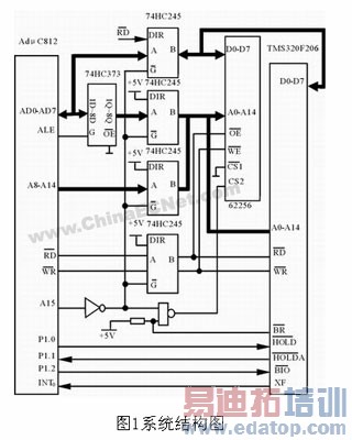 系统的硬件结构如图1所示,存贮器62256作为DSP的全局数据存储器,同时又是ADmC812的外部存储器,两控制器分别通过总线和数据存储器62256相连,实现存储器共享。为了保证两控制器能分别独立地工作。在ADmC812和62256之间插入了4片74HC245进行总线隔离。这样,在ADmC812的控制下,每一时刻只有一个控制器访问62256。图中62256作为ADmC812的外部存储器,A15为片选信号,地址范围为8000H~FFFFH;作为F206的全局数据存储器,用作片选线,使用高端32K字地址范围(8000H~FFFFH)。两片选信号经一与非门和62256的片选线CS2相连,实现片选信号的隔离。