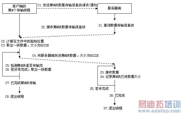 图1是点对点文件断点续传第N块传输过程示意图。在传输发起端(客户端),将大型文件事先分割为大小相当的N块,同时创建N个传输线程,连接目标端服务器。当服务器端接收到每一个连接请求后,告知客户端可以传输文件。当客户端接收到可以传输文件的消息时,首先向服务器发送数据传输信息块(包括第几块、在块中的起始位置)请求,当服务器端接收到该请求后,向客户端发送数据传输信息,客户端然后传输数据传输信息块指定的数据给服务器端,服务器端更新数据传输信息块。