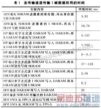 为了保证图像处理和显示的实时性,应充分利用OMAP5910的各数据传输通道,OMAP5910的片内、外存储器的数据传输,如图3所示,图中给出了OMAP5910处理实时图像时的所有数据传输通道,他们的传输速率与存储器的类型有关。为了充分认识OMAP5910的数据传输通道的性能,笔者做了一系列的实验,设置系统时钟为150MHz,工作模式设为全同步模式,使能Ca che的前提下,详细测试了各传输通道传输1帧数据所用的时间,如表1所列。以此为依据来优化数据的传输。