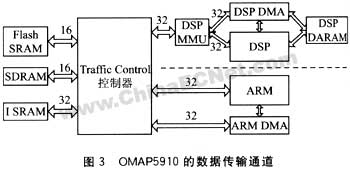 OMAP5910的片内存储器主要由存储器管理单元TC管理。TC管理MPU、DSP、DMA以及局部总线对OMAP5910系统存储资源(SRAM、SDRAM、Flash、ROM等)的访问,它的主要功能是确保处理器能够高效访外部存储区,避免产生瓶颈现象而降低片上处理速度,TC通过3种不同的接口-EMIFS、EMIFF或IMIF,支持处理器或DMA单元对存储器的访问.其中EMIFS接口提供对Flash、SRAM或ROM的访问,EMIFF接口提供对SDRAM的访问,IMIF接口提供对OMAP5910片内192KB SRAM的访问,3种接口是完全独立的[2],从任何一个处理器或DMA单元都可以同时访问。