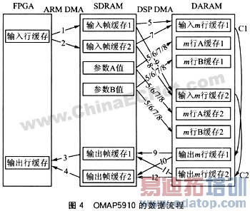 A/D采样的数据首先存放在外部缓冲中,当采集到一定的数据量后,由复杂可编程逻辑器件触发ARM DMA读取数据,依次输入两帧图像保存在SDRAM中,从外挂Flash中取得进行图像处理所需的参数A、B值保存在SDRAM中,与输出帧存以8行为块单位,触发DSP DMA将块数据从OMAP5910的外部缓存区SDRAM搬运到DSP核的双向内部缓存区DARAM,以供DSP核进行计算。有关DMA方式传输的特点,DSP核进行计算的同时,DSP DMA搬运上一块的图像数据(8行)到SDRAM,ARM核接收到输出行数据后,触发ARM DMA把数据搬移到FPGA控制外部存储区,数据流程如图4所示。