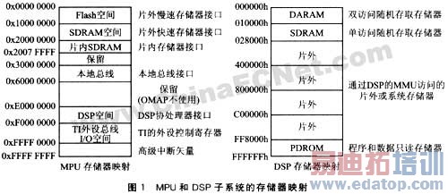 OMAP5910的MPU存储器片内集成了192KB的SRAM,DSP存储器片内集成了64KB的双向DARAM,96KB的单向SARAM,32KB的程序存储器PDROM,MPU和DSP子系统的存储器映射情况如图1所示[1]。通过EMIFF和EMIFS接口,OMAP5910可以访问片外存储器,但访问片外存储器的速度与访问片内存储器的速度差别很大。
