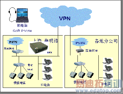 有了这个 IP 电话网络,出差员工可以方便地使用软电话通过网络与公司免费通讯,直接可以通过公司的 IP 电话网,拨打当地电话,实行长话变市话,降低了出差通讯成本。