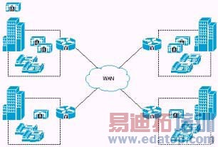 采用集中式呼叫处理的多地点WAN模式包括一个可以为多个地点提供服务的呼叫处理代理,它利用IP WAN在不同的地点之间传输语音流量。IP WAN还负责在中央地点和远程地点之间传输呼叫控制信号。这种模式适用于下面这种情况:一个主要地点通过一个支持QoS的WAN与多个较小的远程地点连接,但是在WAN发生中断时并不需要全部的特性和功能。