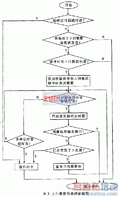 上行数据包处理流程图如图3所法。对数据的处理是在主函数中,因此可有适当的等待和延迟,但必须在协议规定的时间内完成对数据包的处理,它对时间的要求不如中断对时间要求那么苛刻。因为上传数据包的过程是终端主动上载数据信息,链路层对数据包的多少十分清楚,而且在服务器接收到数据包后,肯定应答数据说明数据包传输是否正确,而服务器应答数据包是下行数据在中断中处理。因此,在上传一个数据包后可以等待服务器的应答信号,以确定是否要重发当前数据包。整个处理过程主要应当处理好与中断服务程序的配合,以及用户界面的操作,控制相对比较简单。