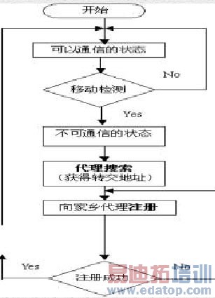 (6)在转交地址处——可能是外地代理或移动节点的一个端口,原始数据包被从隧道中提取出来送给移动节点。从图2.3可以看到移动节点移动到外地的流程。