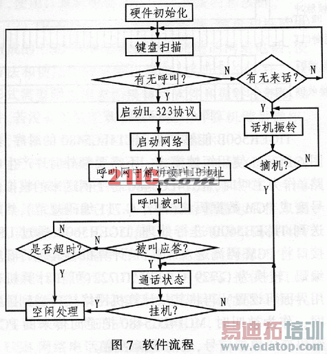 设计键盘扫描、振铃驱动部分使用Tiger Jet Network公司提供的SDK开发包,通过编写驱动软件控制TIGER560B内部寄存器实现。软件流程框图如图7所示。H.323协议软件使用SDK开发包提供的库函数,网络协议软件使用WINDOWS操作系统中的协议。
