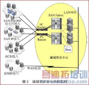 FCIP隧道服务的引入,虽然大大降低了容灾成本,但管理的复杂性、系统设计和远距离容灾节点建立的成本等因素,仍然让很多用户无法享用容灾的好处。因此,国内外的一些政府机构或电信企业都在考虑建立城域容灾中心来普及容灾技术。在进行城域容灾中心设计时,必须考虑各个数据中心的现状,采用各种接入技术。具体如图3所示。