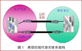 光纤通道SAN Fabric间路由技术(以下简称SAN路由技术)是SAN技术发展的一个巨大突破,填补了传统SAN技术在扩展和远距离延伸方面的空白,使传统SAN容灾网络面临的挑战迎刃而解。SAN路由技术把生产SAN网络和容灾SAN网络连接起来,同时又能使每个Fabric保持相互的独立性,直接避开了SAN Fabric融合带来的所有风险和障碍。随着SAN路由产品推向市场,SAN路由技术已经成为容灾系统的核心组件。典型的现代容灾体系架构如图1所示。