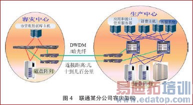 图4是联通某分公司的容灾架构,是电信企业典型的容灾体系。该容灾体系的建立可为电信企业带来了如下的好处:(1)通过DWDM/暗光纤建立快速的容灾网络,实现生产中心和容灾中心数据的实时同步,保障了灾难发生时数据的完整性;(2)引入了SAN路由技术,实现了生产中心和容灾中心逻辑上的隔离,同时部分设备的共享大大提高了容灾系统的稳定性和可靠性;(3)通过SAN广域连接技术,轻松实现跨地域容灾,保障了容灾系统对灾难抵御的完整性;(4)对某些可靠性要求相对较低的数据,可以采用FCIP和SAN路由的结合来作为传输链路,这大大降低了总体的容灾成本,也符合大家倡导的信息生命周期(ILM)的思想;(5)通过SAN路由技术的引入,大大扩展了SAN的扩展能力,为将来全国容灾的整合打下了良好的基础,同时保障了现有投资的有效性。