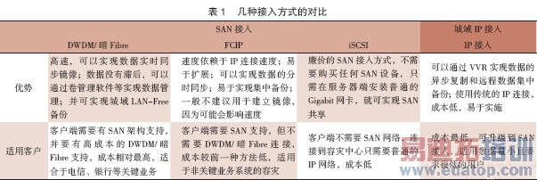 表1对上面提及的4种接入方式进行了对比。不同的接入方式、不同的带宽能力,将决定采用的容灾方式和容灾能力,应该根据实际情况和投入能力来决定最终与容灾中心的连接方式,不能一概而论。当然,从容灾中心的建设角度来讲,这些接入模型已经可以满足各种终端用户的需求,可按需进行适应和调配。
