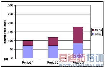 图3显示了在网络中使用转发器和核心设备之间的成本差别。这里的核心设备包括放大器,色散补偿模块,机架以及交换和复用设备。LH方案在所有解决方案中其核心设备成本是最低的,不过却需要更多的转发器。在引入超长途放大器后,R-OADM和OXC都增加了核心成本,不过由于网络透明的关系节省了一定数量的转发器,这对核心成本的增加也形成一定的弥补;第二第三阶段显示出当流量不断增加时,OXC的成本节省优势日益明显。